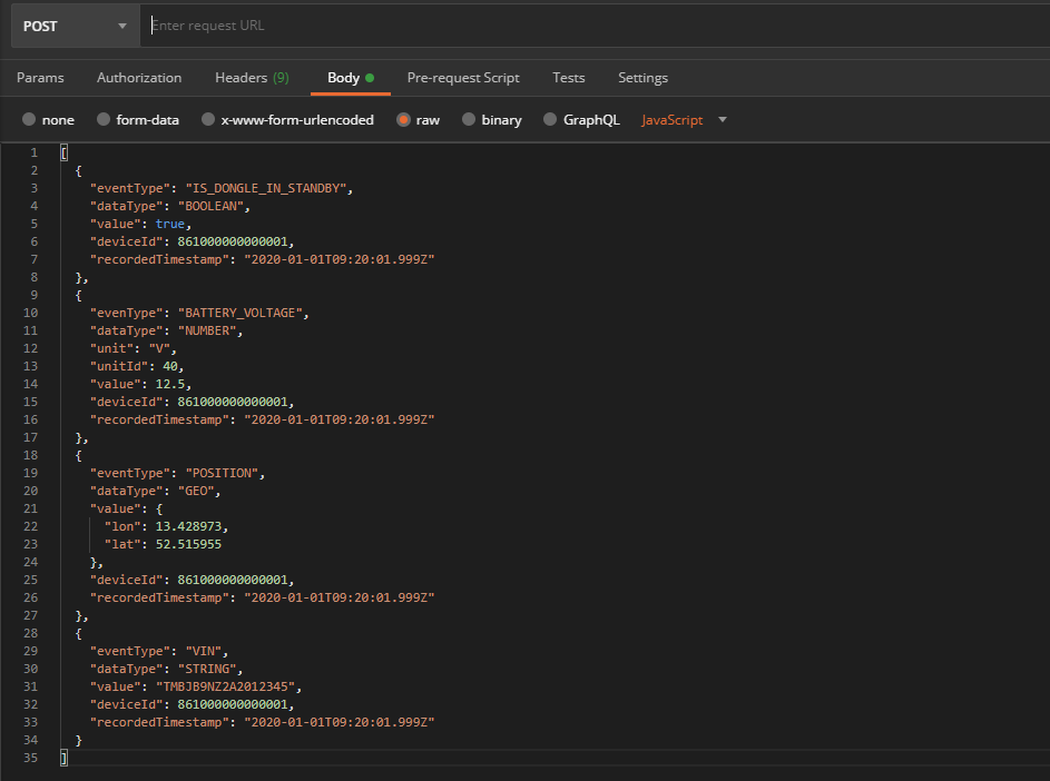To test your endpoint you can take a look at this example with Postman. The POST request body contains 4 events of one device with different data types. Just enter your endpoint url in the request url field and add some events to the request body! Please note that there may be events from multiple devices in one batch.